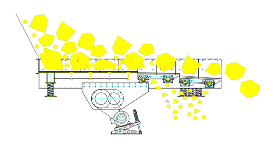 TSW給料機(jī)慣性式雙偏心軸激振器能產(chǎn)生定向激振力。兩軸之間有一對(duì)傳動(dòng)比為1的齒輪副連接,保障其回轉(zhuǎn)方向相反,轉(zhuǎn)速相等。通過電動(dòng)機(jī)驅(qū)動(dòng),兩偏心軸旋轉(zhuǎn),由于兩軸上的偏心質(zhì)量和偏心距大小相等,所產(chǎn)生的慣性力在一個(gè)方向互相抵消,而在另一個(gè)方向互相疊加,從而合成的定向激振力,使與此激振器剛性連接的給料槽體在支承彈簧上做強(qiáng)制振動(dòng),物料在振動(dòng)力的作用下,在料槽上作滑動(dòng)及拋擲運(yùn)動(dòng),從而使物料前移而達(dá)到給料目的。當(dāng)物料通過槽體上的蓖條時(shí),較小的物料通過蓖條之間的間隙落下,不再經(jīng)過破碎而直接進(jìn)入下道破碎工序,從而起到預(yù)篩分效果,充分保障破碎設(shè)備的破碎效率及能力。